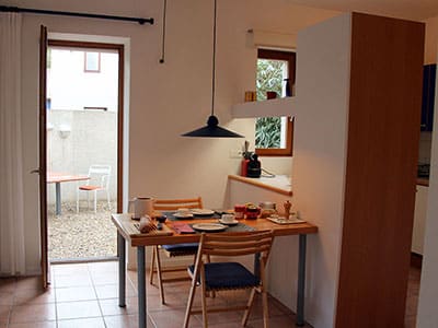 Le rez-de-chaussée et l‘étage ont une jolie vue, côté sud, sur les platanes et l‘imposant escalier menant à la Maison de Maître. Cet ensemble donne une touche de grandeur au jardin. Le jardin patio est accessible par la salle à manger contigüe à la kitchenette.